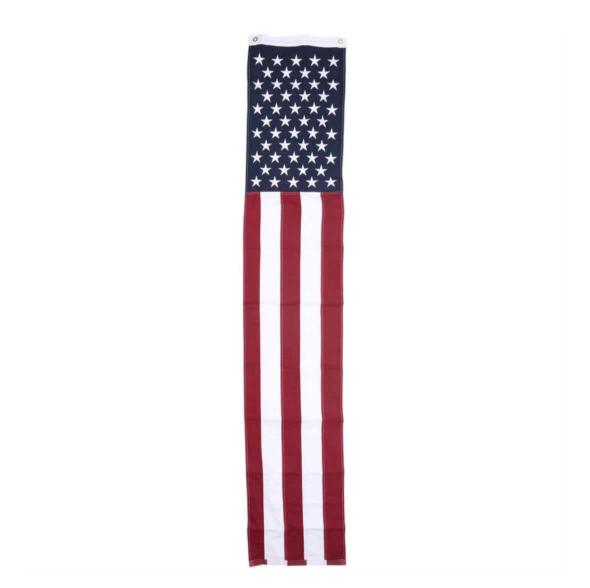A large porch banner from our Patriotic Collection displaying a rustic American flag design. Classic American flag banner features an 84 inch length for a patriotic statement piece indoor or outdoor. Our Patriotic porch banner is easy to display using the metal grommets at the top to hang tight and secure around a porch column. Flag banner is packaged in a polybag with header card and hole for easy rack display. A patriotic home accent perfect for seasonal or everyday display.