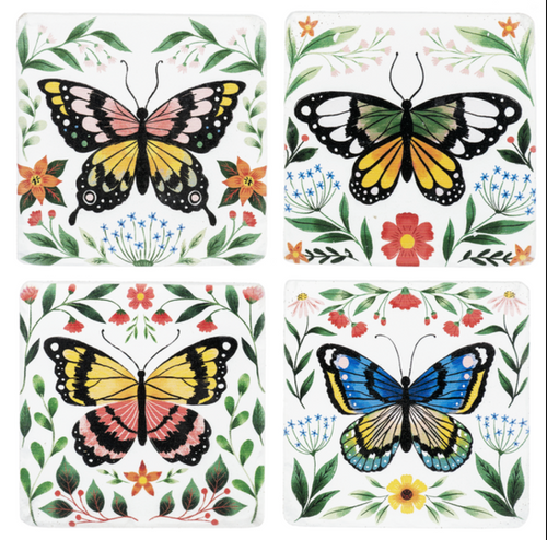 Zinnias & Butterfly Stone Coasters in Wooden Holder S/4
