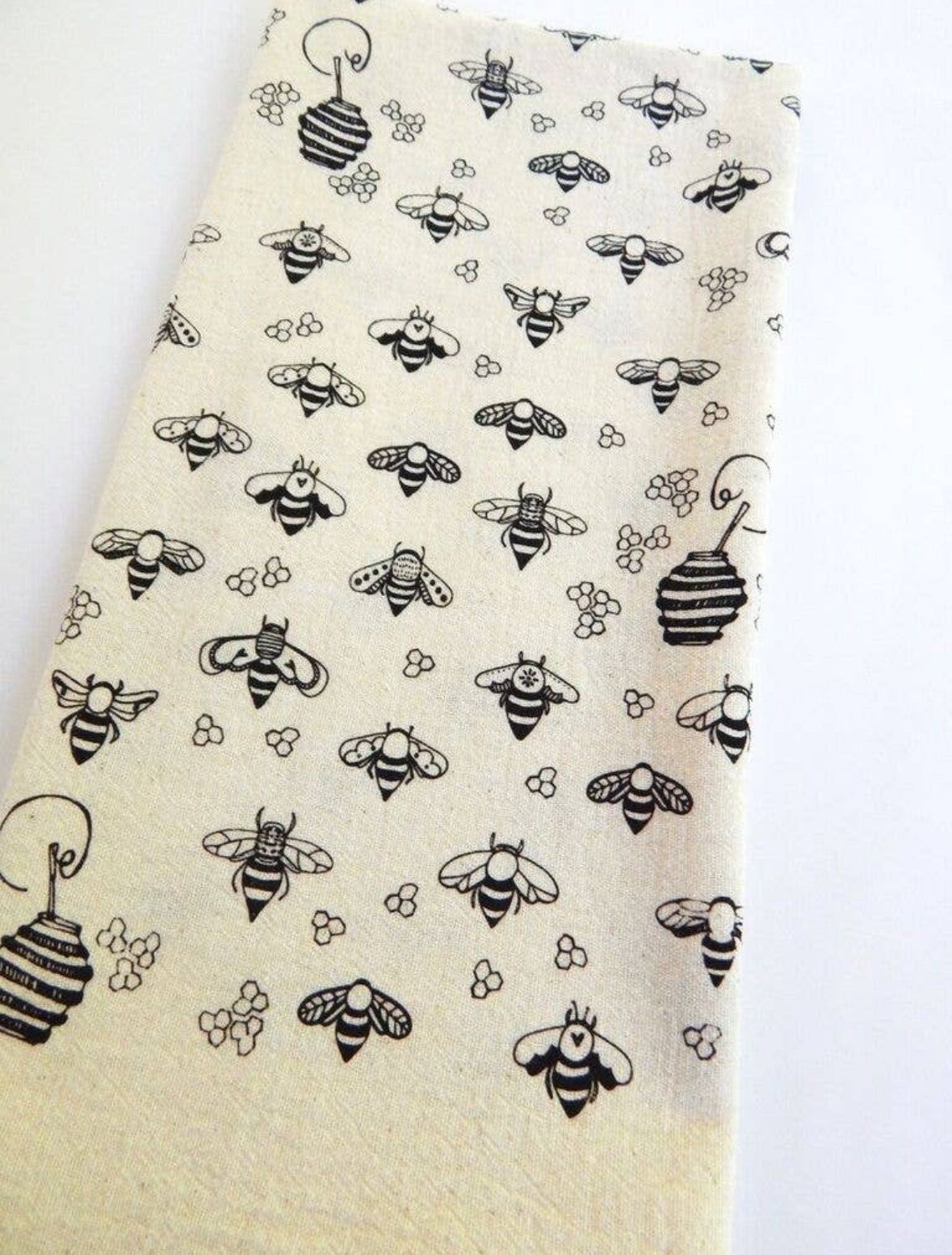 Our Hand Printed Bee Kitchen Dish Towel is made with natural, unbleached cotton. These Dish Towels are super soft and absorbent, long lasting, and a favorite kitchen companion. Hand Printed with our honey bee illustration using water based, environmentally friendly, non toxic, and permanent inks.