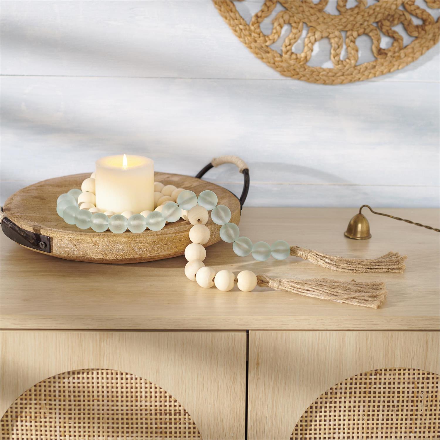 A decorative garland from our Beach Collection displaying wood and glass beads along a jute rope. Garland features light natural wood beads and green sea glass beads with jute tassels at each end. Our Wood And Sea Glass garland includes 58 inches of length for plenty of coverage. A neutral everyday home accent with a variety of display options.