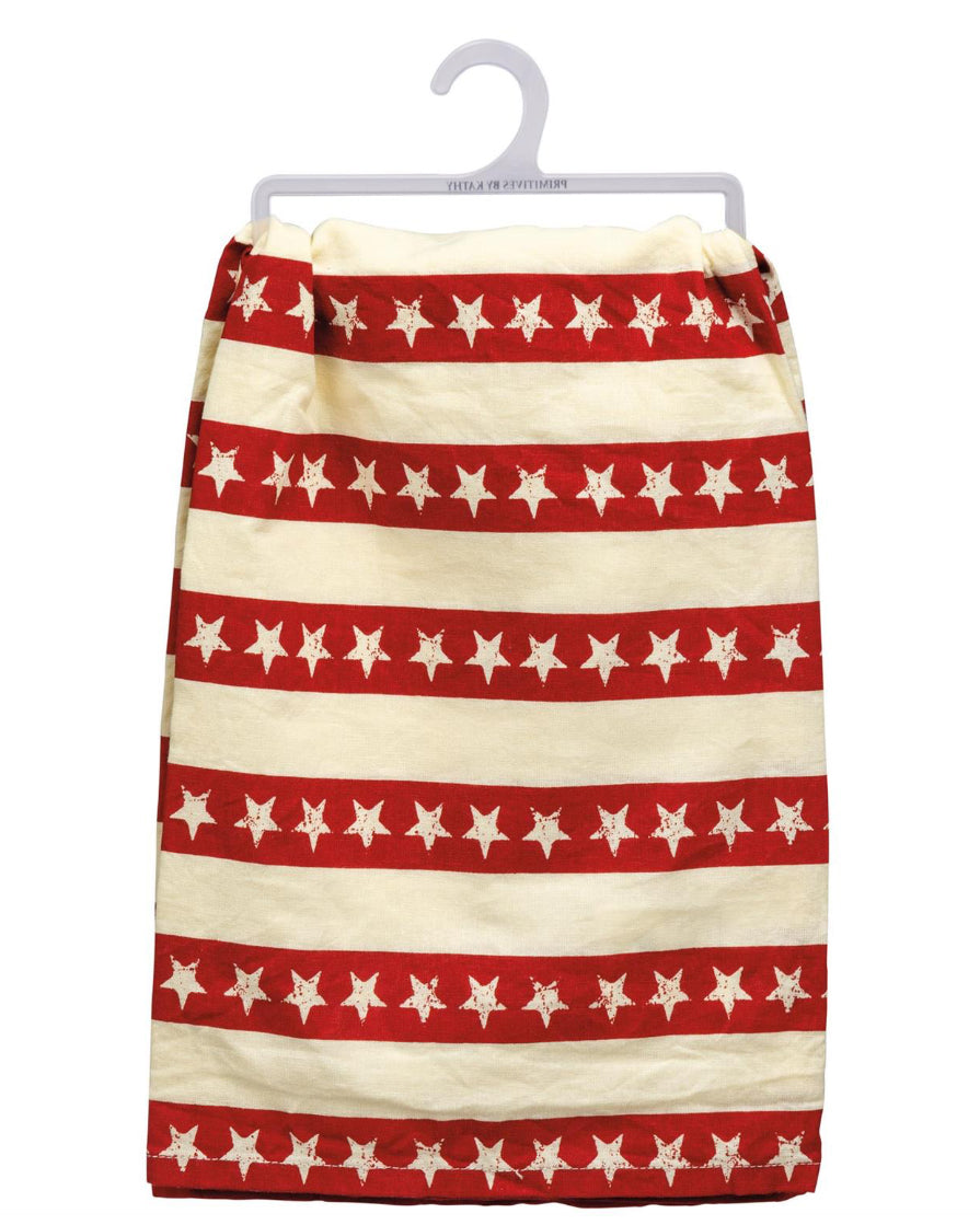 A cotton kitchen towel featuring a stars and stripes design and a patriotic palette with a "Stars & Stripes Forever" sentiment. Machine-washable.