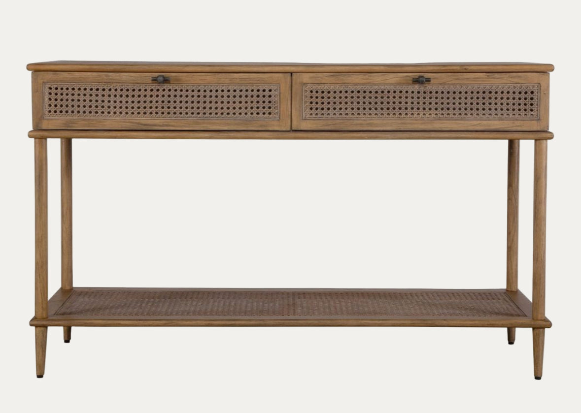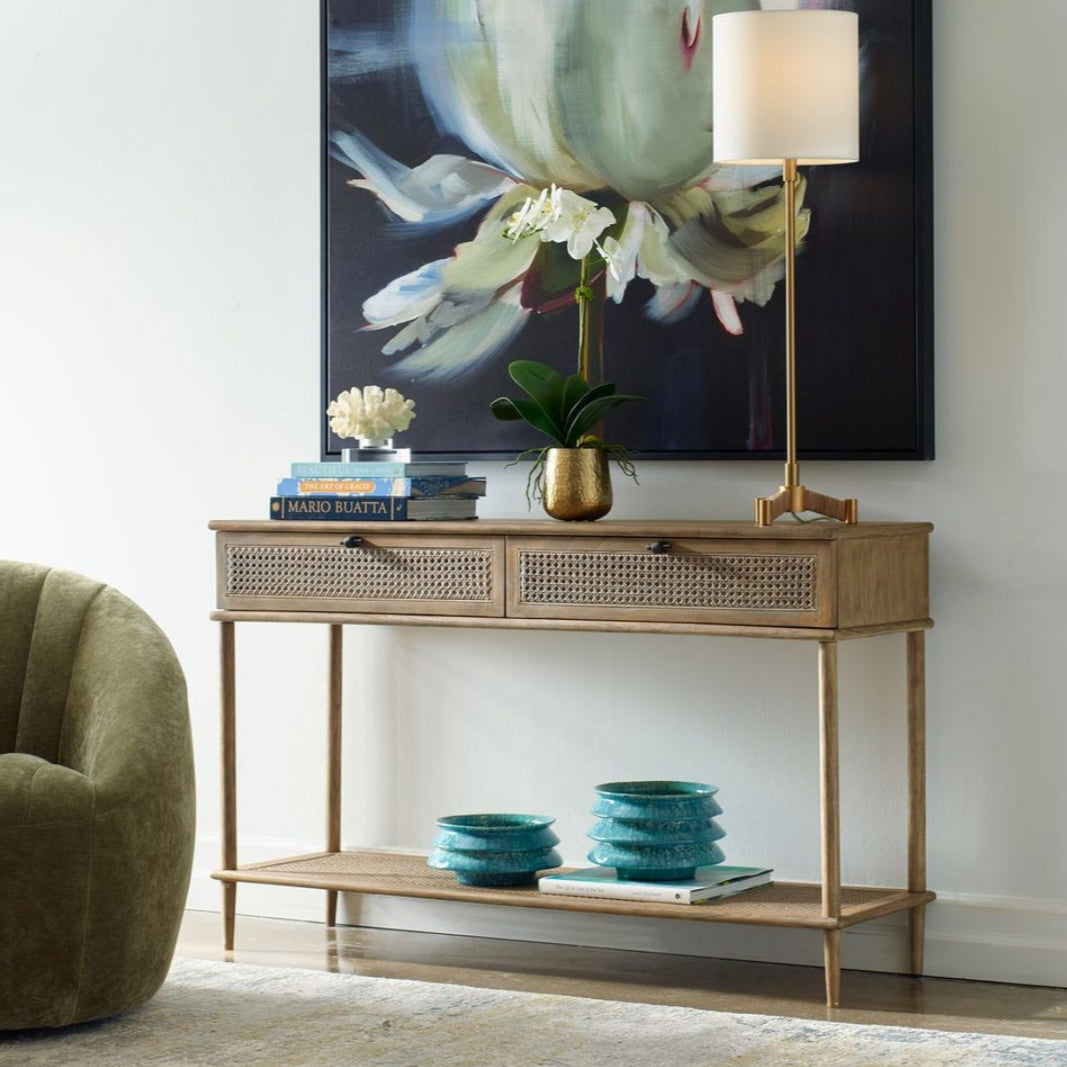Mid century inspired with accents of natural rattan cane, this console table features mindi solids and veneers finished in a soft oak stain. The Coast table has one storage shelf and two drawers with metal hardware finished in dark gunmetal.