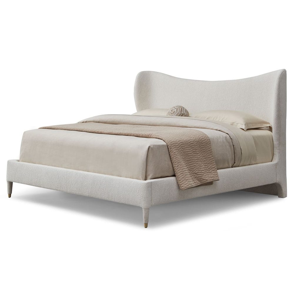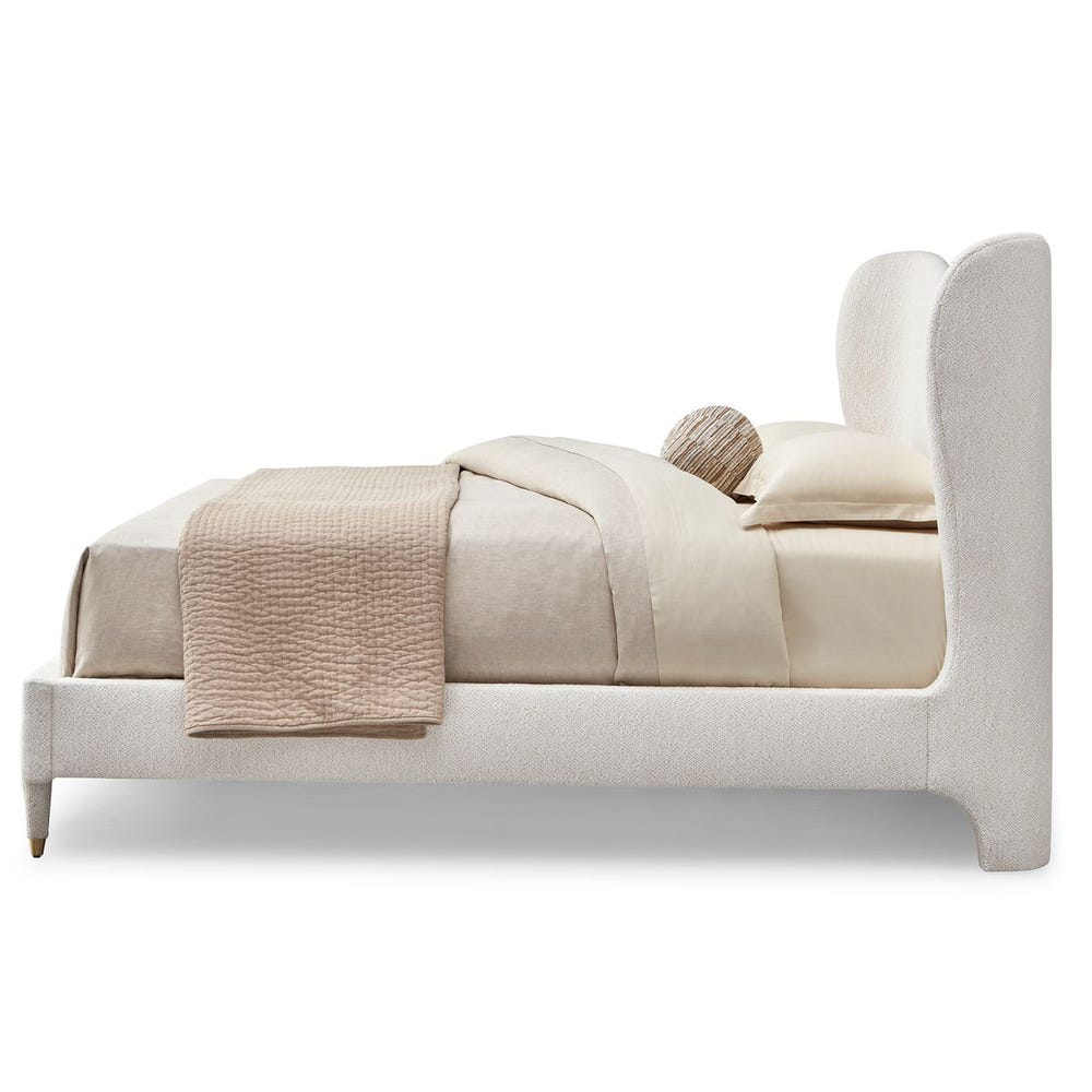 A haven of relaxation, the Cocoon Bed features a gently swooping upholstered headboard with wingback Made of solid hardwood, the bed is fully upholstered on all sides, and padded with foam, poly fiber and cotton. The feet are beautifully finished with solid brass ferrules. Upholstered in a warm white chenille with bronze undertones, with stain free, anti-microbial, anti-bacterial, mildew and odor resistant properties.