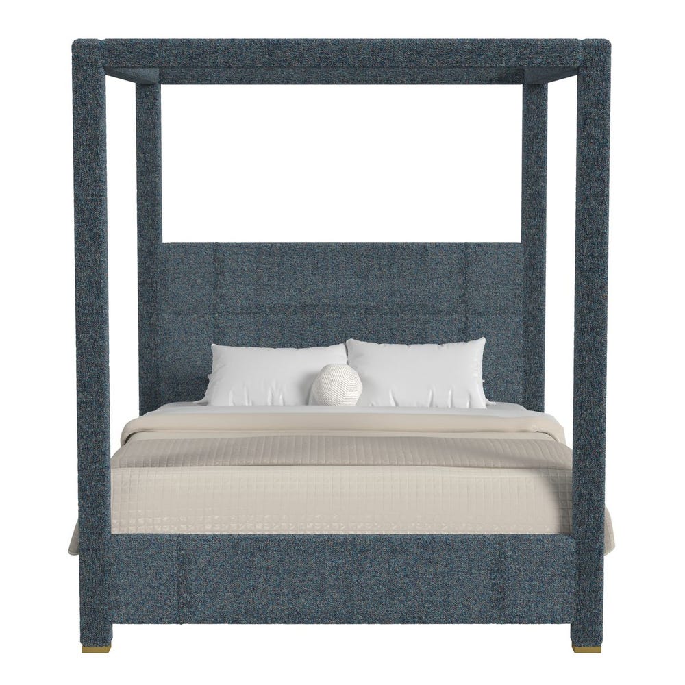 Our Hibernate Bed surrounds you in comfort featuring a three-paneled upholstered headboard, four posters and canopy. Made of hardwood, the bed is fully upholstered on all sides, and wrapped with foam, poly fiber and cotton and solid brass feet. Assembly includes headboard, foot board, four posts, four canopy rails, two side rails and five mattress rails. Fully upholstered in a subtle herringbone in light bronze, mixed with chenille threads of blue, teal and aqua. The Crypton fabric is stain-free, anti-microbial, anti-bacterial, mildew- and odor-resistant.