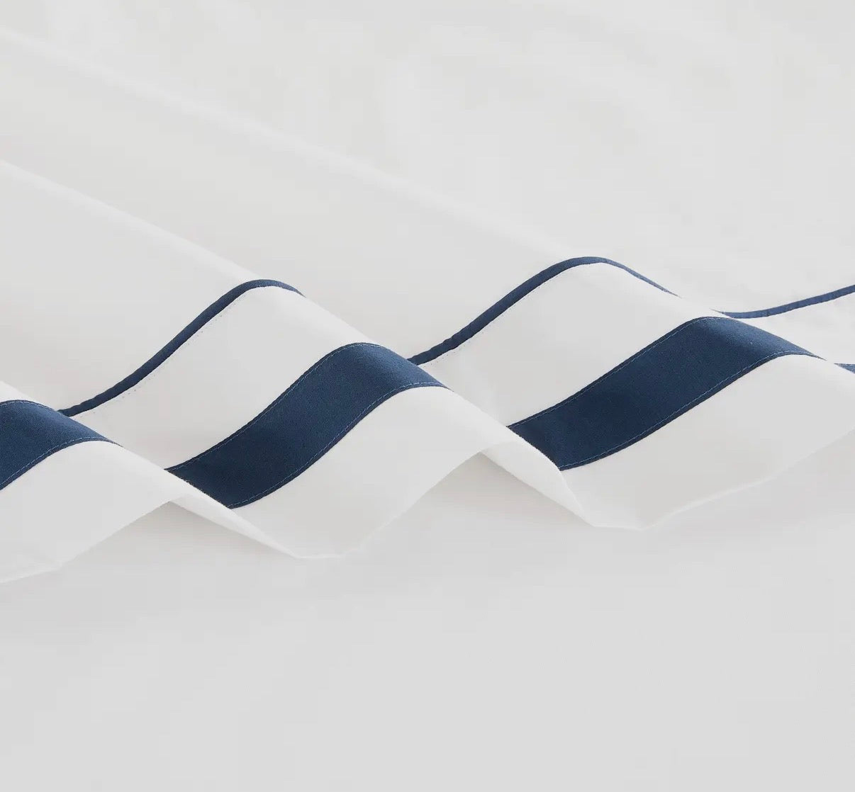 We weave our Percale bedding by laying one warp thread over one weft thread in a one-to-one ratio. This produces a fabric with a matte finish that is soft yet durable, crisp and cool to the touch. We added a tailored band and piping to the edge for sophisticated luxury and style.