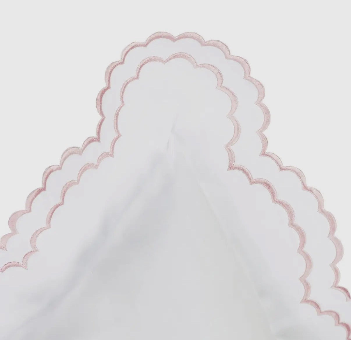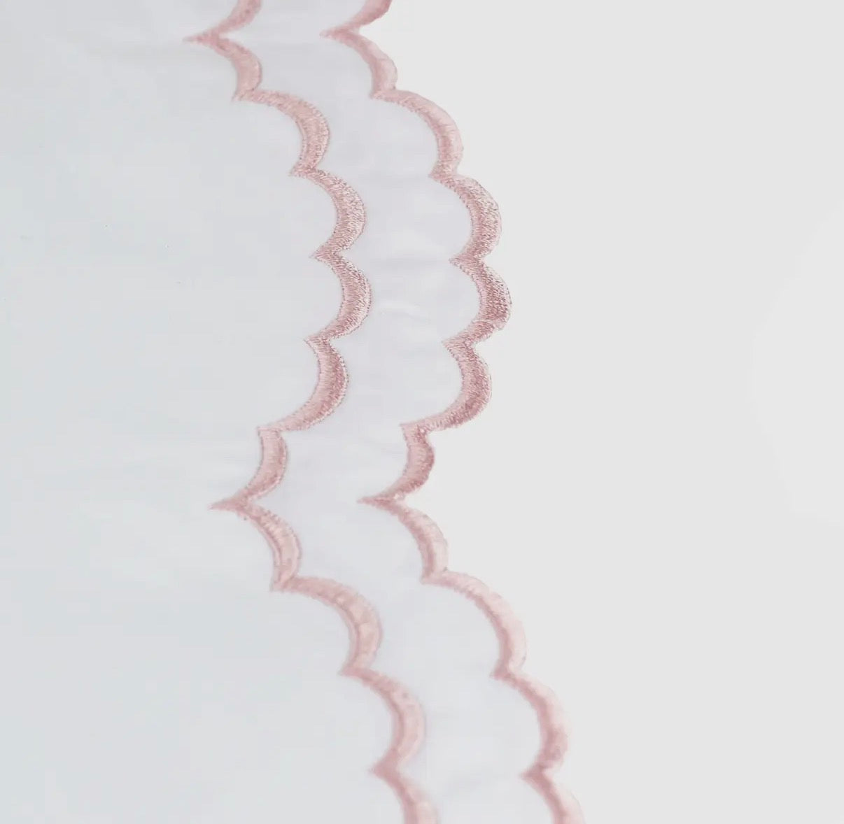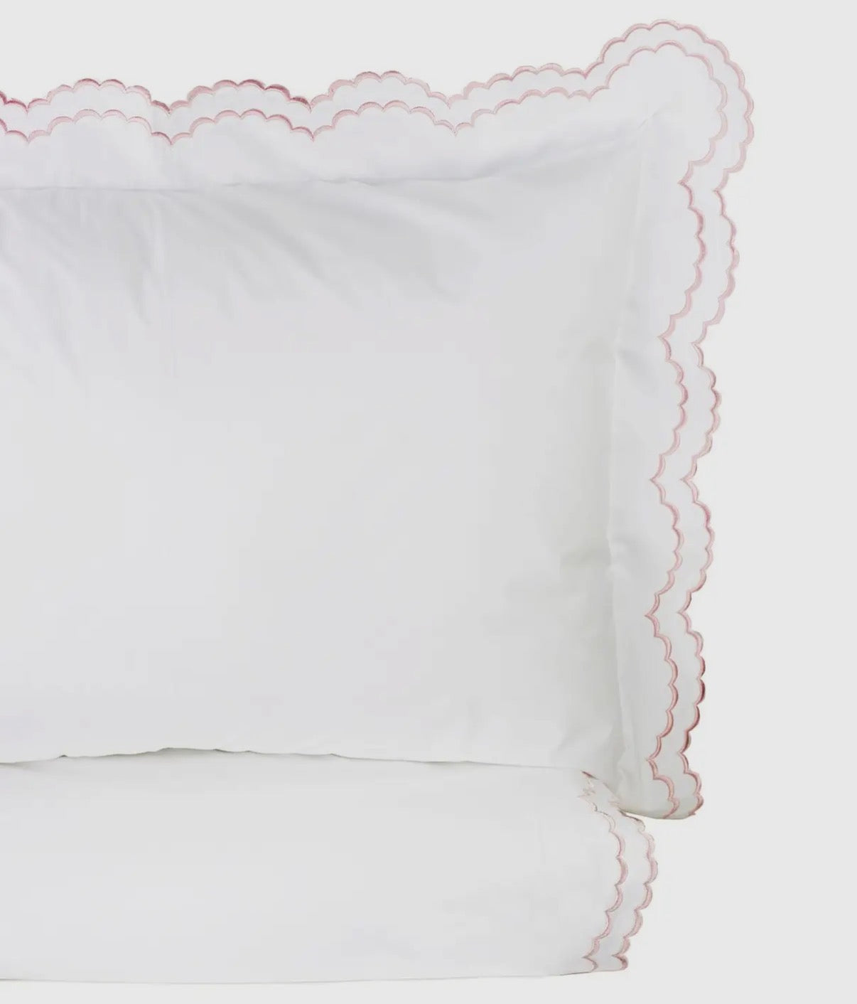 We weave our percale duvet sets by laying one warp thread over one weft thread in a one-to-one ratio. This produces a duvet set with a matte finish that is soft yet durable, crisp and cool to the touch. We add a beautiful embroidered double scalloped stitch to the edge for added luxury and style.
