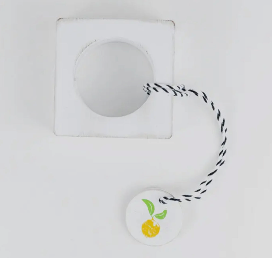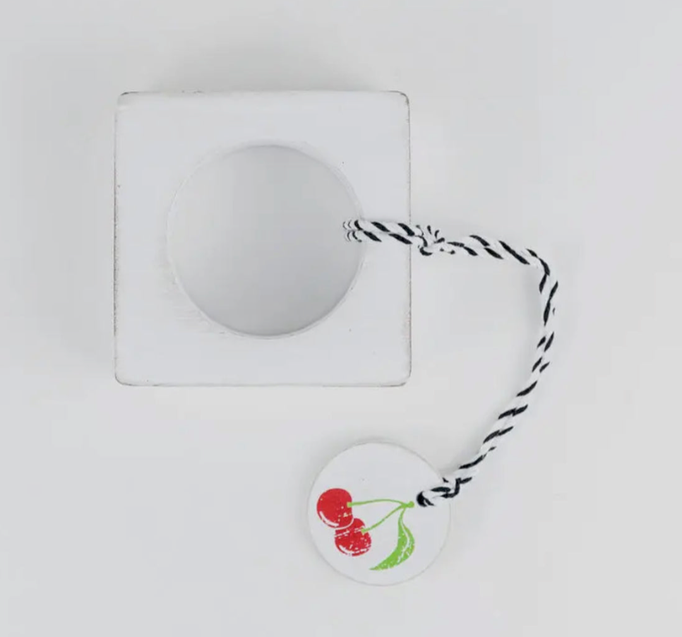 Set your table with this festive Cherry napkin ring with wooden tag.