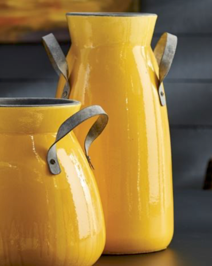 This is one in a series of updated vintage-inspired milk jugs oozing character and charm. From the metal handles to the dripping, uneven glaze, they make a sophisticated, colorful vignette.