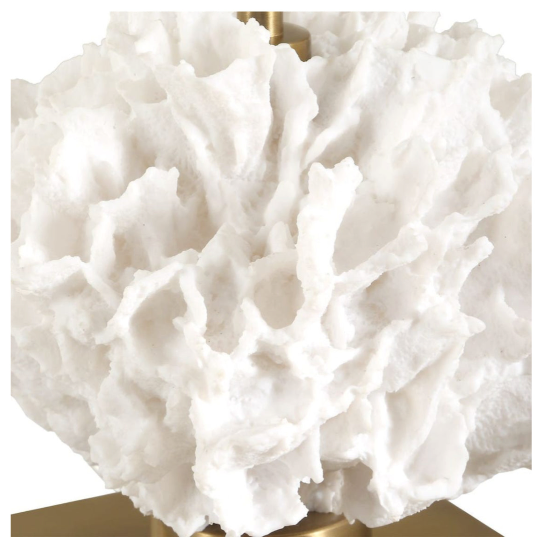 This Buffet Lamp showcases an ivory toned coral sculpture, accented with antique brass plated iron details. The slightly tapered round shade is a casual ivory linen fabric with light slubbing.
