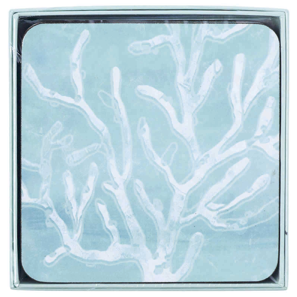 Cerulean Sea Coral Square Coasters Set of 4 are scratch-resistant and cork-backed. Great for casual entertaining and are gift boxed and makes a fun host gift.
