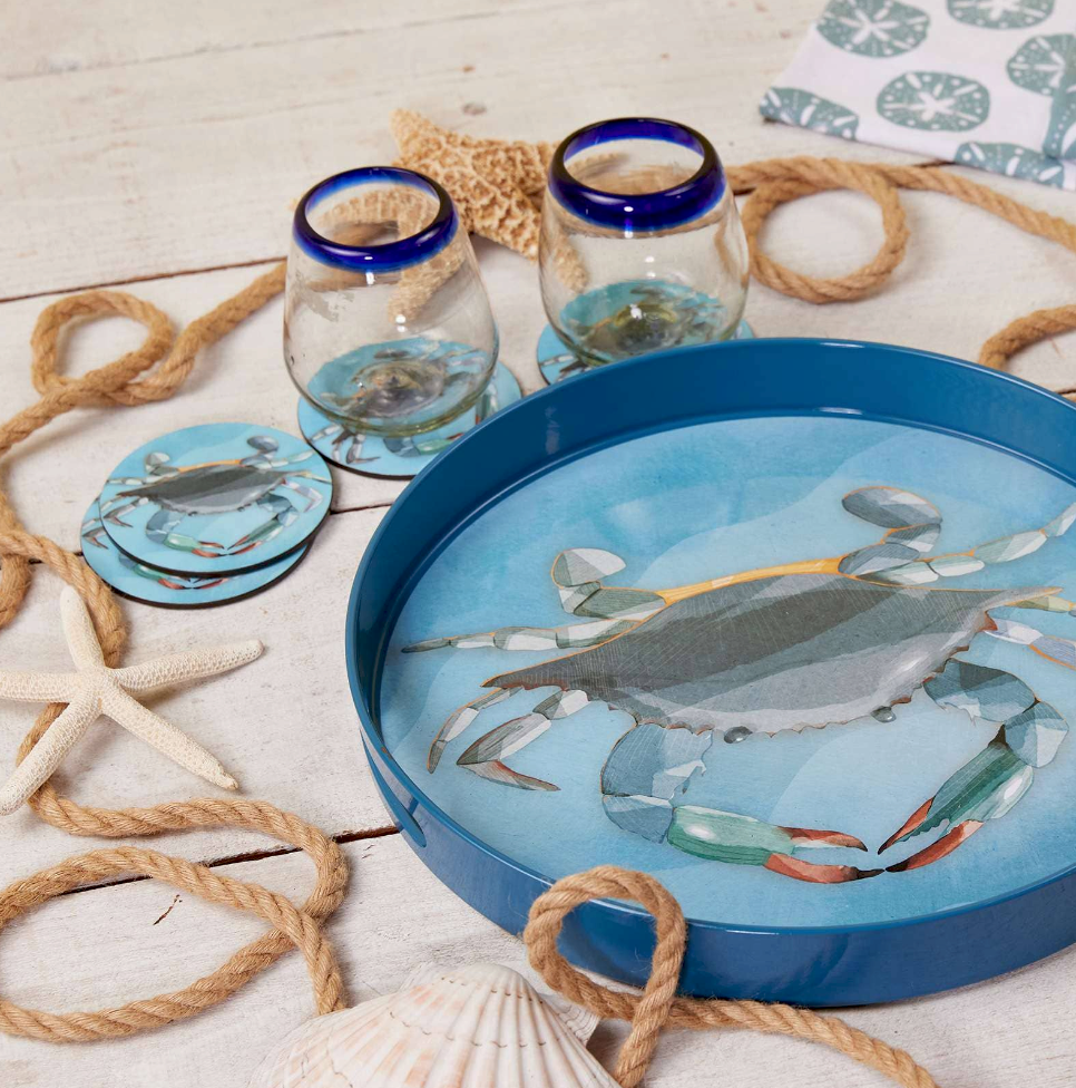 Our Round Crab Coasters are scratch-resistant and non-slip, cork-backed. Great for casual entertaining and makes a fun host gift. Four piece gift set.