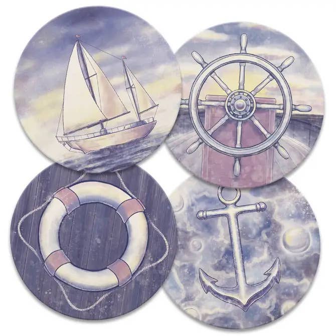 Our Nautical Icons Stone Coasters are made of absorbent stone to absorb excess condensation from beverages. Cork backing protects your surfaces from scratches and stains. Each coaster Features a smooth edge to give it a classic appearance. This Coaster Set makes a wonderful gift for family and friends at any time of the year.